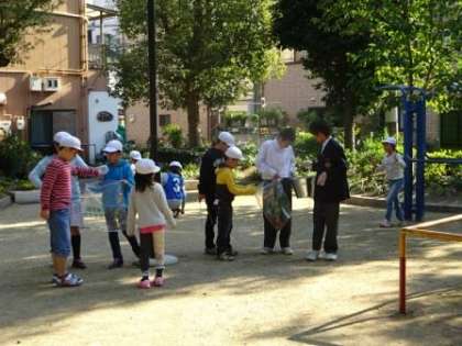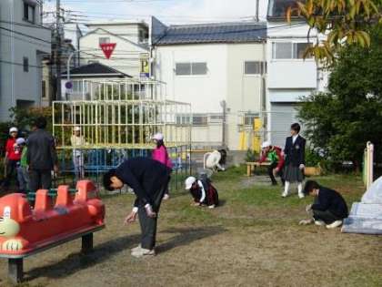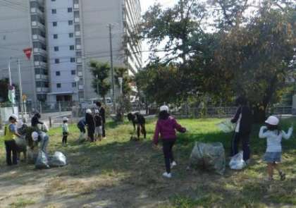 校内は運動場周辺と学習園付近、校外は、正門前広場とシーソー公園・地球公園、入舟南公園の草取りや落ち葉ひろい、ゴミ拾いをしました。