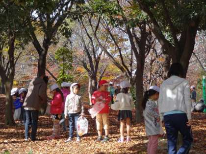 1・2年生児童が今日の午前中、紅葉の八幡屋公園に行き、落ち葉拾いをしました。