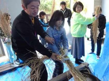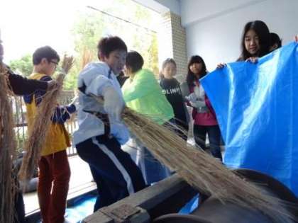学校の水田で収穫して干してあった稲の脱穀をしました。「千羽こき」という道具を使って行いました。足を踏んでドラムを回転させ、稲からもみを落としていきます。最初は、こわごわやっていましたが、だんだん慣れてきました。