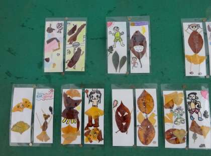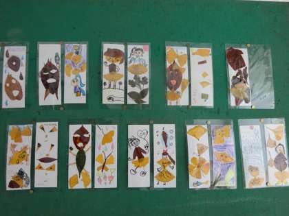 1階廊下には、八幡屋公園で拾ってきた落ち葉で作った2年生のしおりが飾られています。