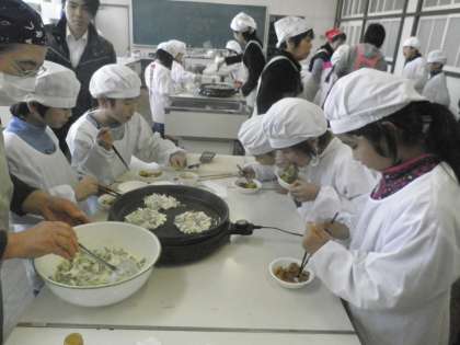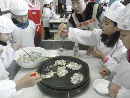 6班に分かれ、お待ちかねの「青ネギ」を使った海鮮チヂミづくりが始まりました。