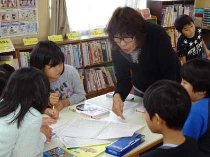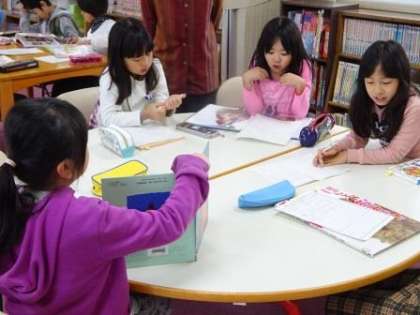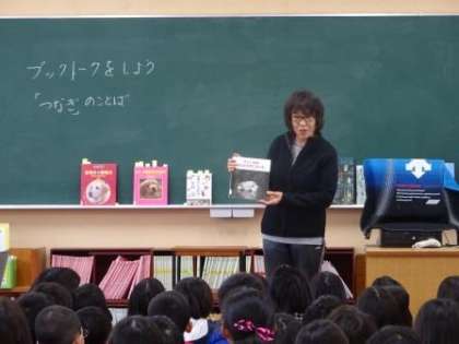 「ブックトークをしよう」の単元で、自分で決めたテーマに沿った本の紹介と次の本へ移るための「つなぎ」のことばを考えた後、本を使って、ブックトークの練習をしました。もう1時間練習した後は、他の学年に行って、実際にブックトークをします。