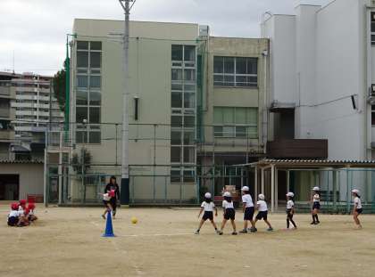 体育の時間、担任の先生とサポーターの先生との2グループに分かれて、キックベースをしました。