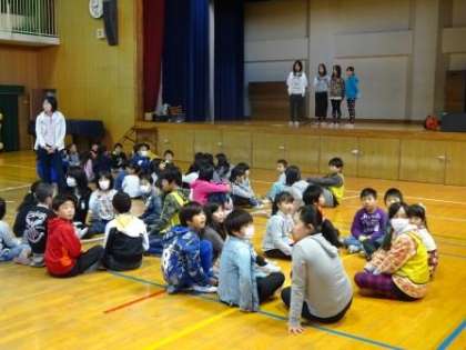 児童集会では、「先生当てクイズ」をしました。5つのヒントを聴いて、班で答えを考えました。