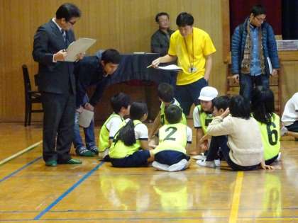 対抗ゲームを終えた後、チームで反省し、次の時間の課題を見つけました。