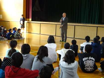 上段:港中学校の校長先生や生徒会代表からのお話がありました。