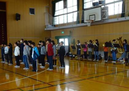 中段:両小学校の交流会。八幡屋小学校の3択クイズの後、キッズバンドの児童の演奏に合わせて、「校歌」と「海へ」の歌を歌いました。