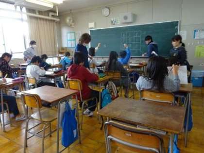 上段:数学の授業体験。魔方陣に取り組みました。たし算したら各列と各行が同じ和になるというものです。3×3から始まって夢中になりました。