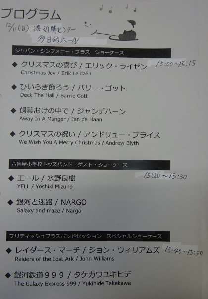 キッズバンド八幡屋は、港近隣センターで本日午後3時から行われるジャパン シンフォニー ブラスのプロムナードコンサートに参加して演奏します。プログラムは下記のとおりです。