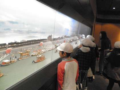 中:大川を進む船。街並みや乗り込んだ人々まで細かく再現されています。