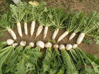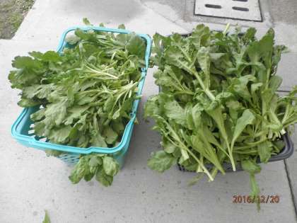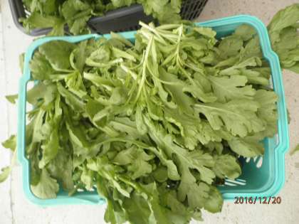 聖護院かぶらと青首大根、菊菜がとれました。管理作業員さんが大根を分けて新聞紙に包んで、5年生は菊菜、6年生はかぶらか大根を持って帰らせました。
