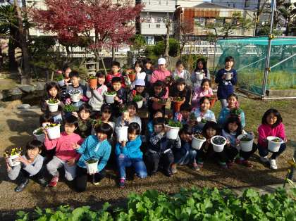自分で植えて水をやった花の鉢を持って、各学年で集合写真を撮りました。家に持ち帰って、世話をします。学校の植木鉢は、花がなくなったら、学校に持ってきてください。