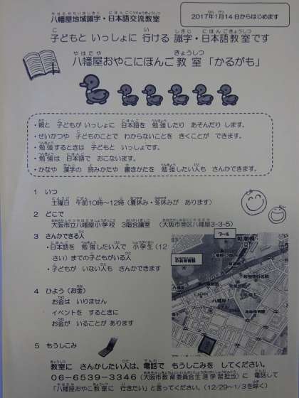 平成29年(2017年)1月14日(土)から「八幡屋 おやこ にほんご 教室 【かるがも】」が始まります。毎週土曜日の午前10時〜12時まで、八幡屋小学校 3階会議室(生涯学習教室)で行います。日本語を勉強したい人なら、小学生までの子どもがいる人も子どもがいない人も参加できます。申し込みは、06(6539)3346まで電話して「八幡屋おやこ教室にいきたい。」と言ってください。(平日9時から午後5時まで)。入り口は東門(講堂正面入り口側の門)です。