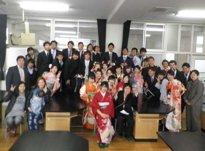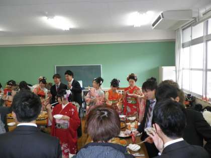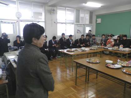 成人式の後、八幡屋小学校の卒業生が教室に集まって、旧担任の先生方を囲んだ集いを行いました。小学校の時の映像を見たり、タイムカプセルを開いたりして、思い出や近況を語り合いました。なお、当日の会場や軽食の準備は、保護者の方が午前中からされていました。