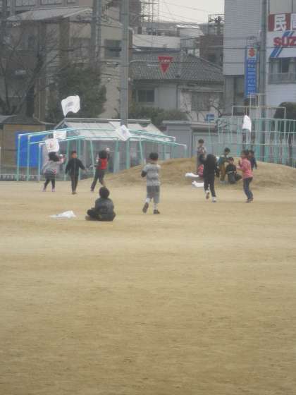 前日に、校長先生から凧糸の結び方や、揚げ方を教わったおかげで風のない運動場でも上手にあげることができました。2年生とのかるた大会も楽しく遊びました。