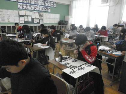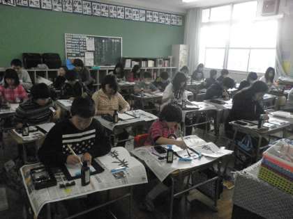 やっぱり最高学年です。教室に入ると真剣に取り組む空気が漂い、筆を持つ姿も様になっています。「未来の夢」集中力のいる題材に挑戦しました。