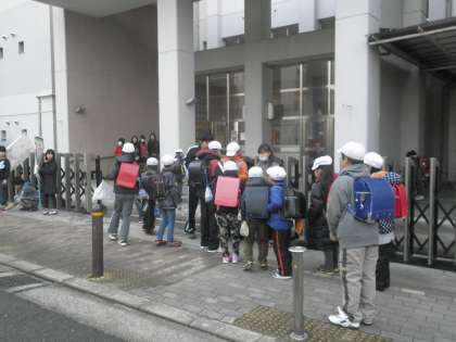 「のぼり」を持ち、校門に立つ代表委員。寒いのに早く登校し頑張ってます。