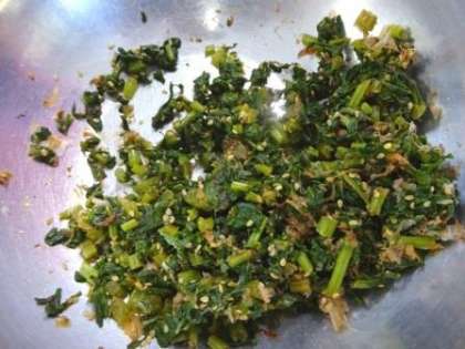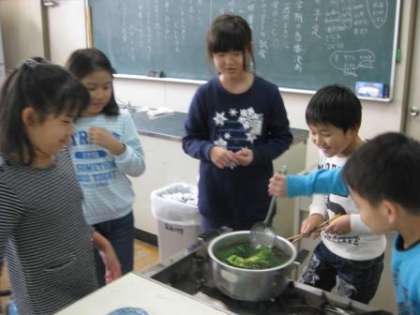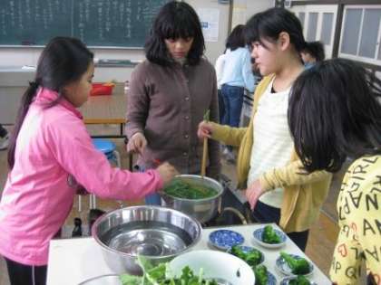 きのうの委員会で八幡屋農園でとれた大根のはっぱをゆでて、さらにいためてかつおぶしなどをくわえてふりかけを作りました。