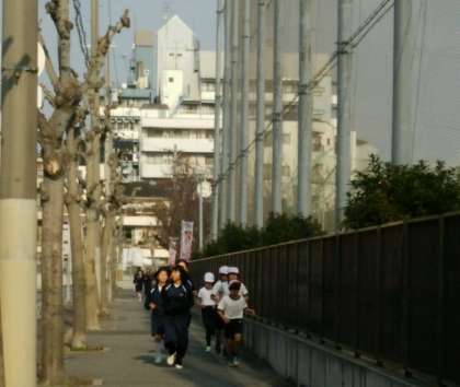 学校の外周りをコースの確認をしながら走りました。本番は、学校の周りを1周ずつします。