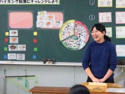 栄養指導の先生に来ていただいて「バイキング教室にチャレンジしましょう」というテーマで授業をしていただきました。栄養のバランスがとれた給食をめざして、主食・主菜・副菜がそろうように、料理を組み合わせてみました。