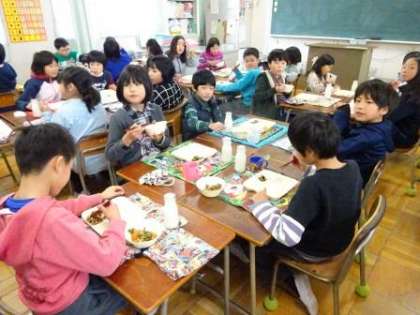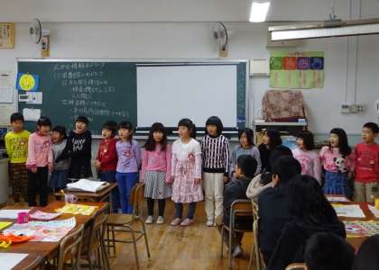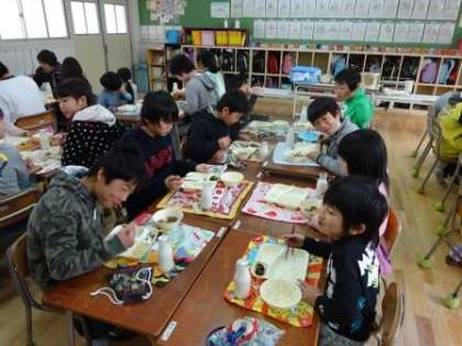 今年は1年と5年、2年と6年、3年と4年が交流給食をしました。給食前と後に歌などの出しものがありました。給食調理員さんやふだん職員室で給食をいただいている教職員も入って仲良く給食をいただきました。昼休みも一緒に遊びました。