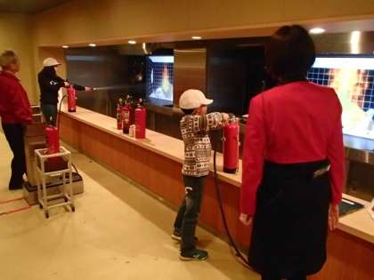 上段:初期消火訓練。水消火器を使って、火を消す訓練をしました。