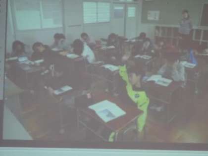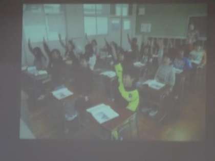 右段:給食があるとき。授業に集中して、みんな挙手しています。