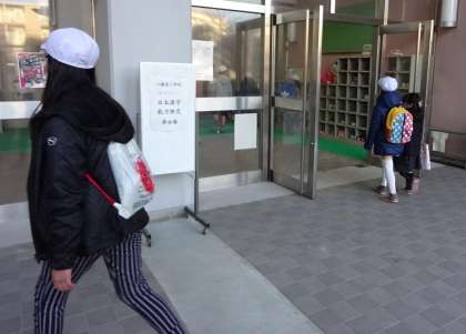 上段:玄関の「日本漢字能力検定 準会場」の看板を見ながら登校。