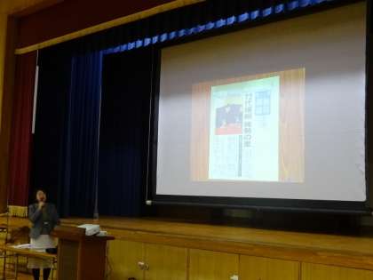 上段:校長先生からは、芸術鑑賞会と、新横綱「稀勢の里」の子ども時代のエピソードについてお話がありました。校長戦略支援予算で購入した実物投影機を使って、新聞記事を明るく投影しています。