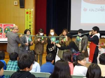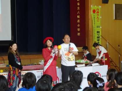 青森県の三村知事が講師として、「ミスりんごあおもり」や若手生産者の方と、青森りんごについて、クイズや体験を交えて楽しく教えてくださいました。