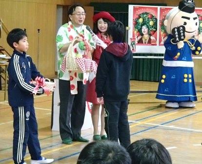 下段:代表の児童に「青森りんごキッズ」の認定証とりんごのプレゼントの贈呈。