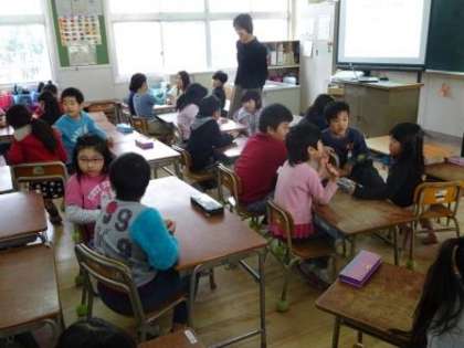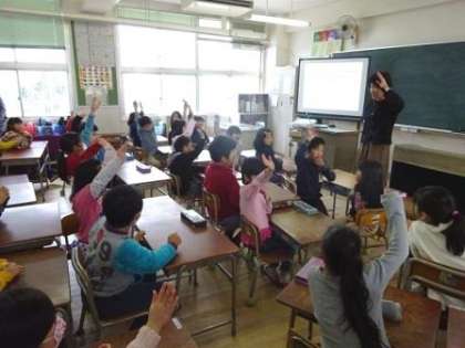 道徳「地しんからみをまもろう」。映像を使い、グループでの話し合って発表したりしながら学習しました。