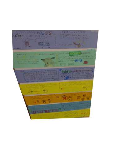 図書室での図書の授業の時に、3・4年生が作った「本の帯」が図書室前の廊下に展示されています。自分が読んだ本の紹介がよくわかるように書かれています。