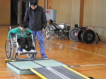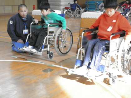 下:跳び箱で車いすがぎりぎり通れる幅を作り、その間を通ります。ハンドリムを握った手が当たりそうです。