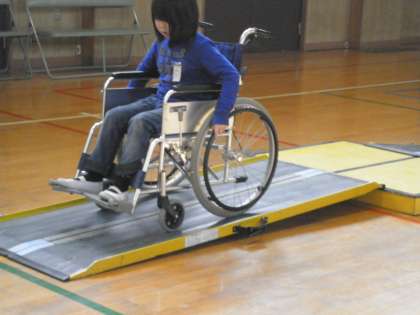 中:スロープを下ります。ハンドリムを握り、速さをコントロールします。