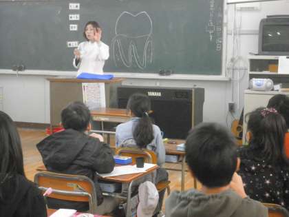 毎年4年生は、歯科衛生士さんから歯の仕組みやむし歯にならないための生活、歯みがきの方法を教えてもらいます。実際に歯ブラシを持って、自分の歯をていねいに磨きました。ご家庭でも子どもたちに話を聞いていただき、家族で実践していただければと思います。