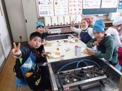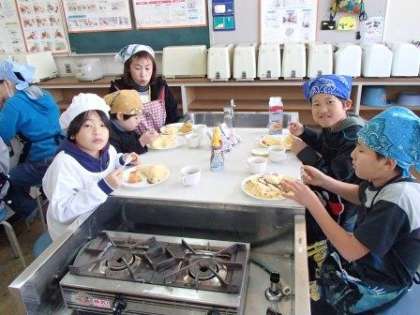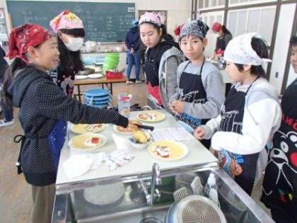 5年生は、調理実習でケーキとクレープを作りました。ケーキは炊飯器で焼いて、クレープはフライパンで焼いて生クリーム・カスタードクリームなどでラッッピングしました。イチゴやバナナの入った豪華なデザートで、とてもおいしかったです。