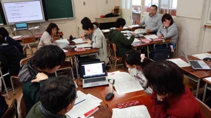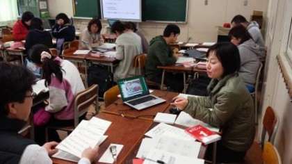 池島小学校で、八幡屋小学校・池島小学校の教職員研修を行ないました。講師の先生の指導のもと、班に分かれて模擬授業をしたりしました。