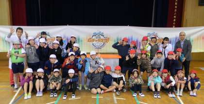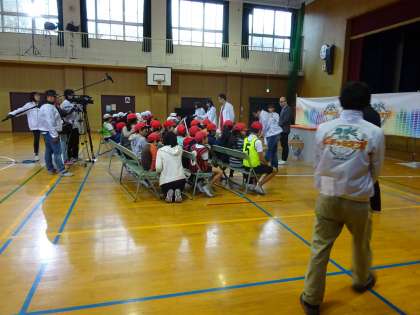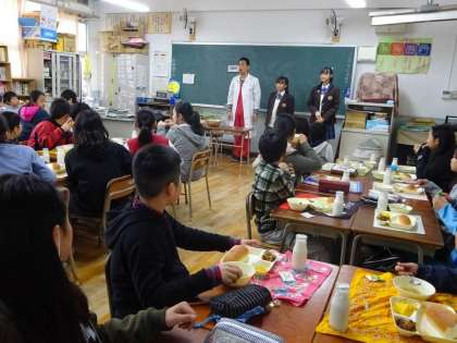 上段:収録の日。給食の時間に、5年1組教室まで、石田靖さんとたこやきレインボーが、あいさつに来られて、質問にも答えていただきました。