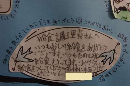 1月下旬の給食週間のときに、感謝の気持ちをこめて各学級から贈られた全員の寄せ書きのひとつひとつに、給食調理員さんが返事を書いてくれました。今日から各学級で掲示されました。