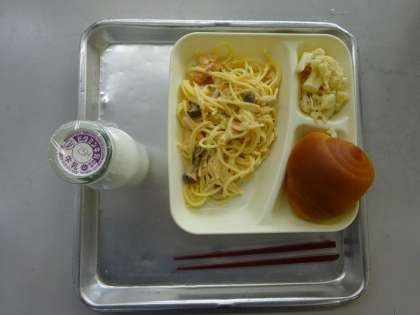 下段:今年度最後の給食。「さけのクリームスパゲッティ、カリフラワーのピクルス、パン、牛乳」。