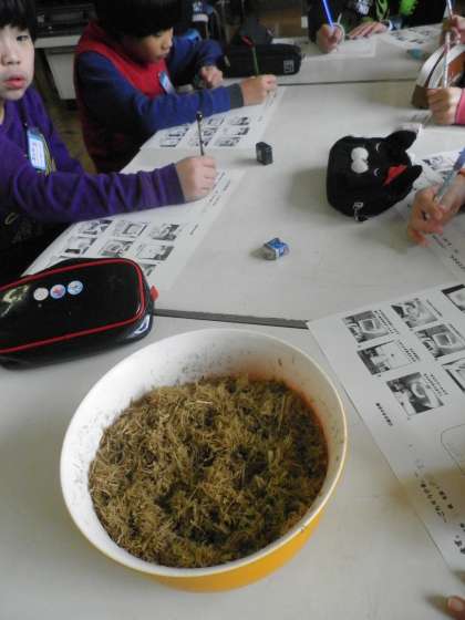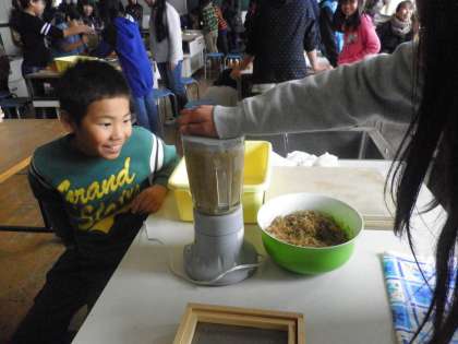 5年生は、春の田植え以来学習してきた体験学習の集大成として、稲わらを利用した「紙すき」実習を行いました。