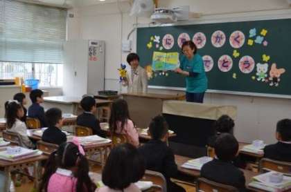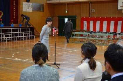 中段:担任が保護者に講堂でお願いをしている間、読みきかせボランティアの方が新入生のための本を用意して読み聞かせをしてくださいました。今、読みきかせボランティアを募集中です。希望される方は、教頭までお知らせください。