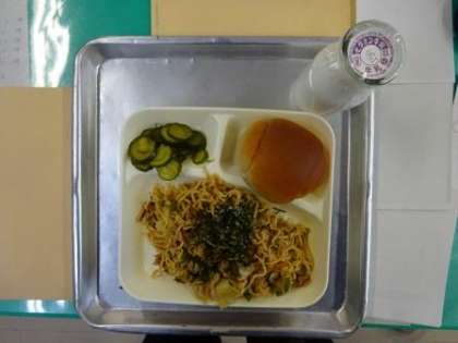 今日のメニューは、焼きそば、きゅうりのしょうがづけ、パン、牛乳です。1年生にとって初めての給食でした。明日は入学お祝い献立でカツカレーライスです。楽しみですね!