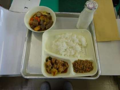 今日の給食は、焼きとり・豚肉とあつあげの煮物・紅ざけそぼろ・米飯・牛乳です。