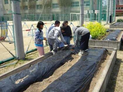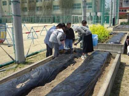 学習園栽培活動のトップは6年生です。理科の学習で観察・実験するジャガイモを植えました。