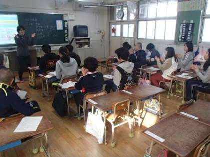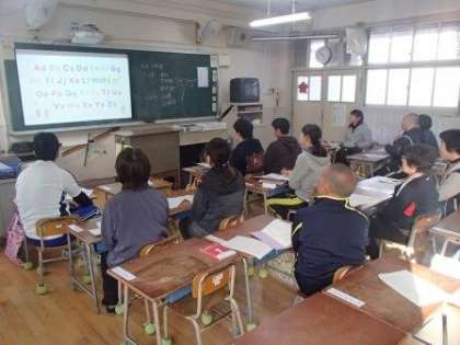 本校は今年から外国語活動を全学年で行う予定にしています。高学年が金曜日の午後に行う授業以外に、水曜日の清掃時間に各学級で外国語活動を行います。そこで、ただ今、教える先生も現在勉強中です。