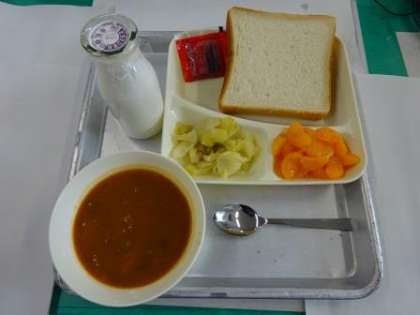 今日の給食はビーフシチュー・キャベツのピクルス・みかん・食パン・牛乳・ストロベリージャムです。今日まで1年生の給食のお手伝いを6年生がしてくれていました。6年生の皆さん、1年生のために給食の準備をしてくれてありがとうございました。明日からは1年生は自分たちで給食を運んだり配膳したりします。1年生の皆さん明日からはがんばりましょう。