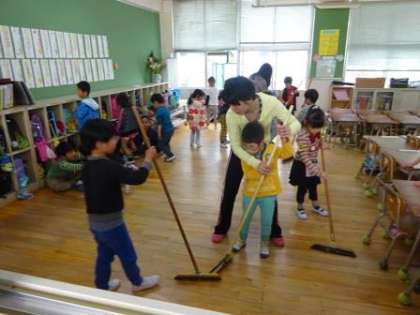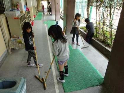 今まで6年生にお世話になっていた1年生の教室掃除も、今は自分たちで行っています。先生にほうきのはき方やそうじの仕方を教えてもらいながら頑張っていました。その一方で2年生は今まで教えてもらったことを活かして、ほうきで隅々までていねいにはいたり、手洗い場をたわしでごしごしこすったりしてきれいにしていました。