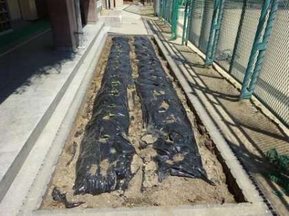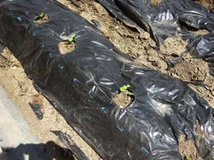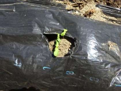 低学年の教室の前にある花壇を見ると、マルチの穴から植物の芽がでていました。児童がこれから毎日お世話をして、立派な花を咲かせてくれることを楽しみにしています。